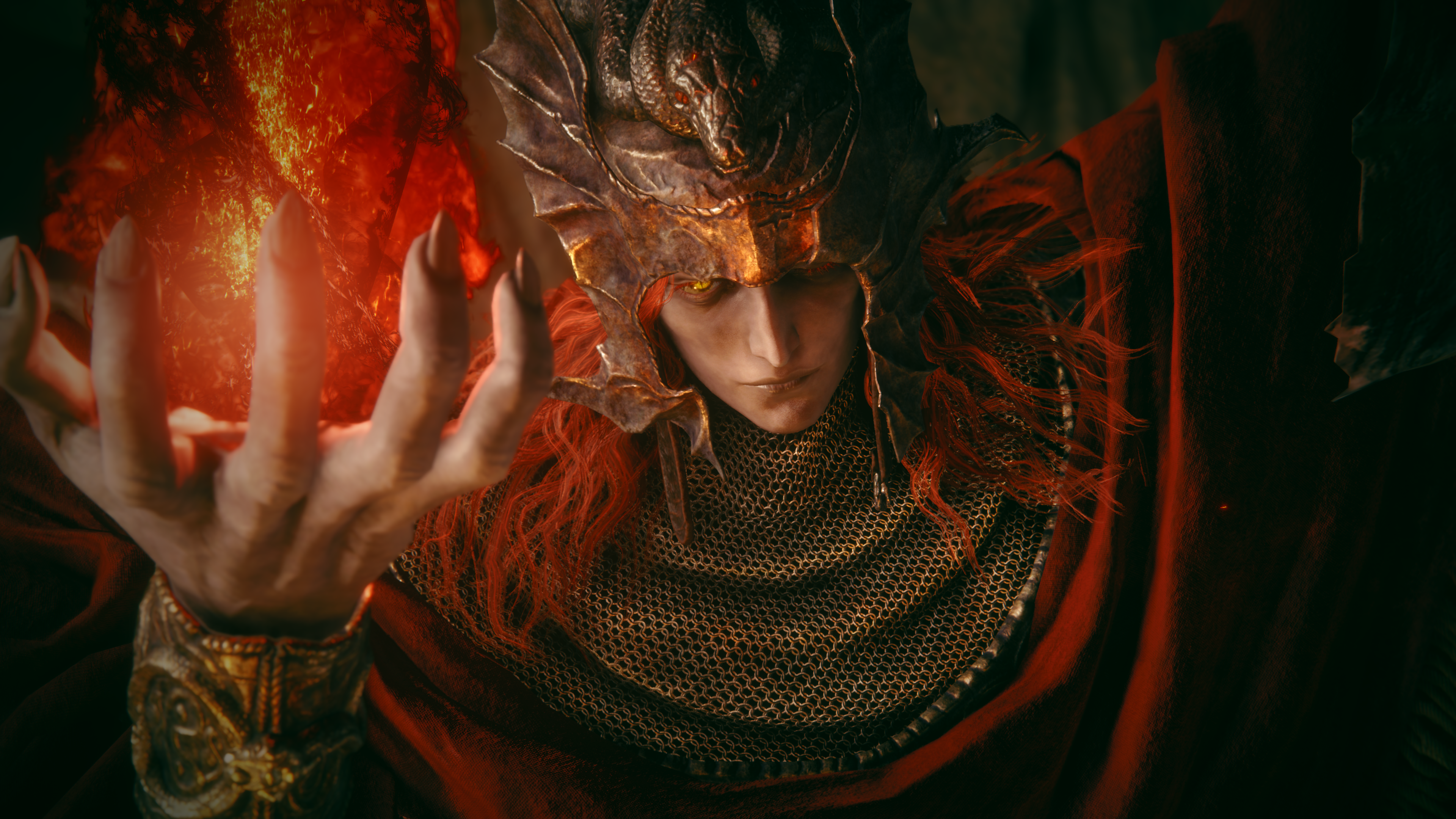 With his red hair and name beginning with M, you might assume he is related to another powerful adversary, Malenia Blade of Miquella. Though since he's accompanied by a red serpent, Messer could just as well have something in common with Rykard, Lord of Blasphemy. His draconic designs, from his helmet to the dragon wings sprouting from his outfit, could also suggest he communes with dragons.
