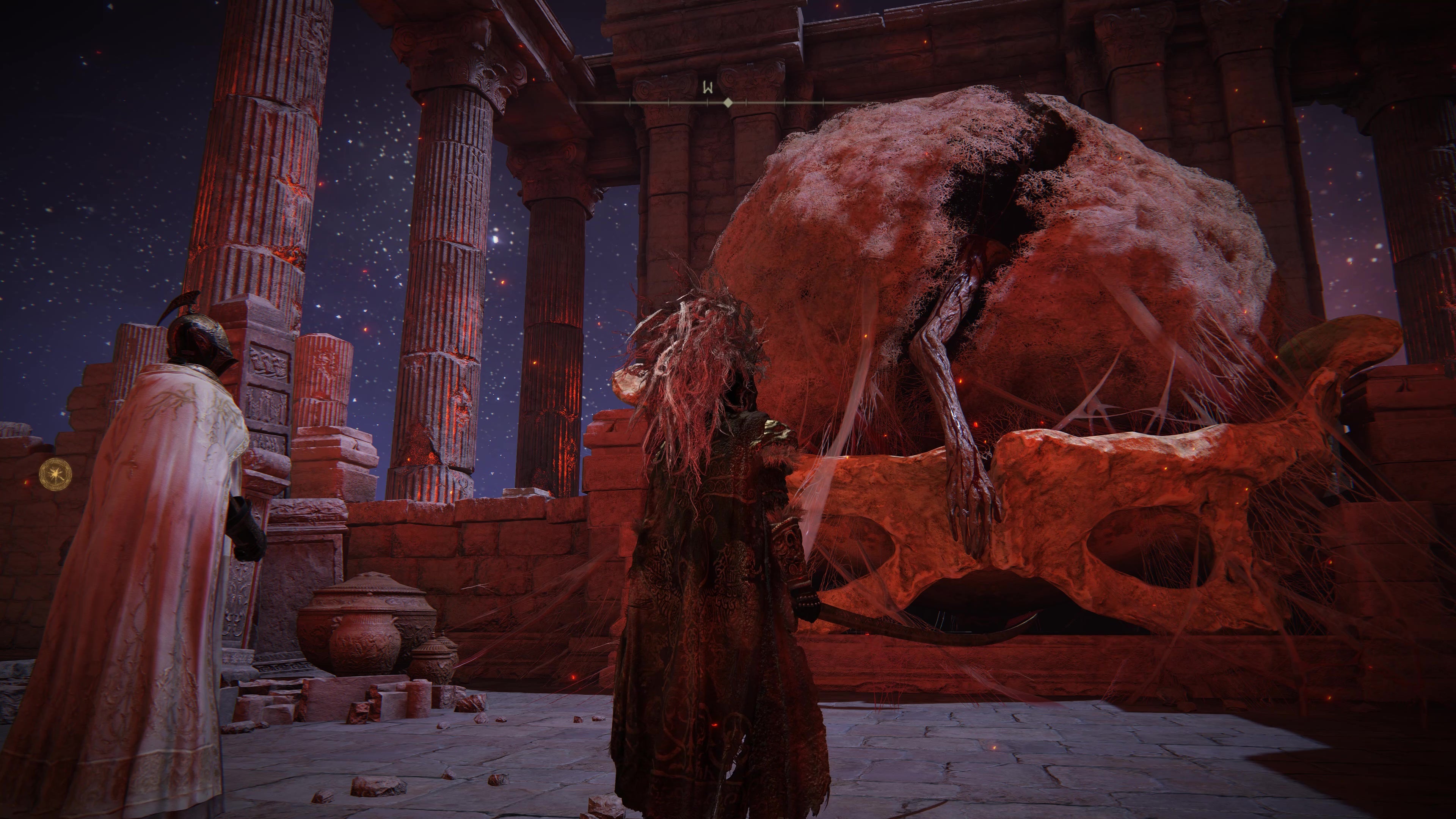 There, you'll find a new NPC called Leda standing near the cocoon. You can chat with her if you like, and she'll tell you to touch the withered arm sticking out of the cocoon. This will transport you to "the realm of shadow where Miquella the Kind now dwells", so once you've wrapped up your conversation, head on over to that bloodstained hand in front of you.