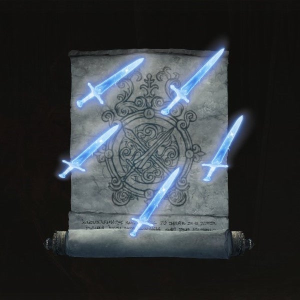 Creates sigil that forms three projectile glintblades after delay. | 12 | Int 28 | Castle Ensis, on a corpse on top of the chapel where you fight Moonrithyll, Carian Knight. |