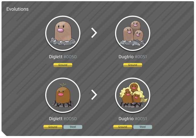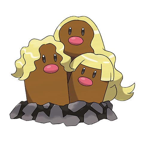 Like Drilbur and Excadrill, Diglett and Alolan Diglett are Ground and Ground/Steel Pokémon respectively. There has been lots of speculation over what the body of these subterranean (no, not the Subterrene Pokémon) look like below ground. There's also speculation as to which brand of shampoo Alolan Dugtrio uses, because that Pokémon easily has the best hair in the Pokémon universe. Slay, Dugtrio.