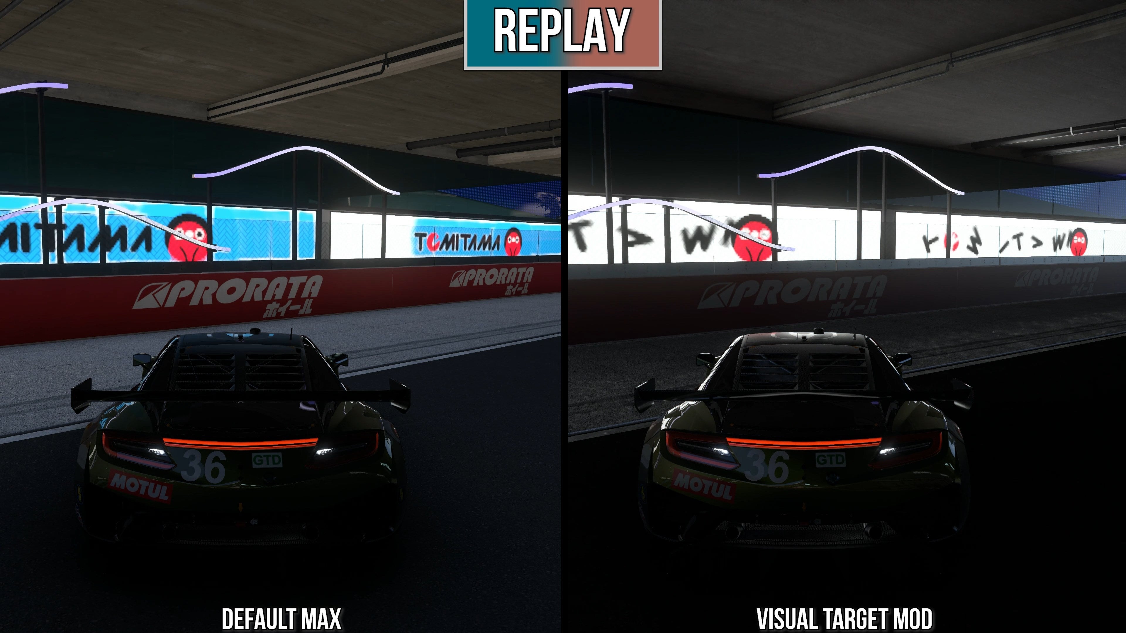 In general, the RT upgrades look great - but they aren't quite ready for the shipping game. While raining, reflections on the road do not present correctly with the mod engageg. Meanwhile, in night-time racing, a lot of lights lose their shadows for reasons unknown, giving the game an overly diffuse look. So, if you are interested in checking out the mod, stick to day races with clear weather if you can.