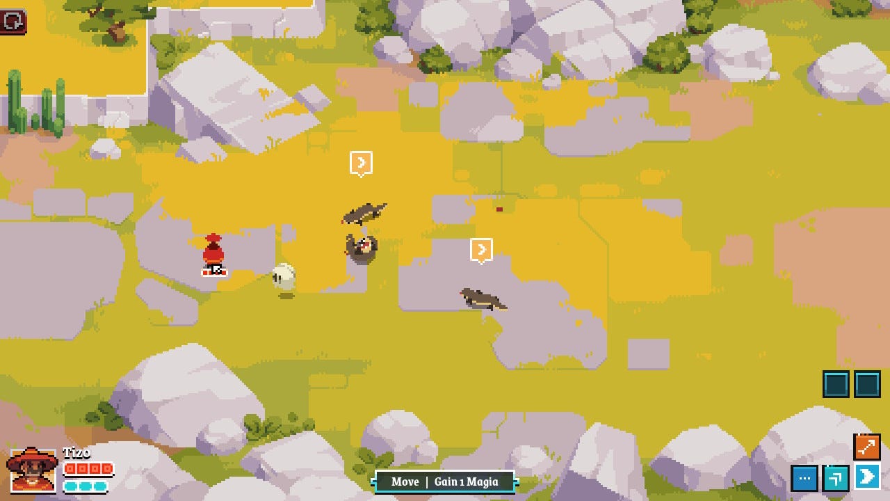 The fun of all this comes from the attacks - yours and your enemies - and also environmental dangers. In the second act, for example, I was playing as an archer, which meant that I had an arrow that I could use to deal damage when enemies were in range, but I also had a lot of fun plugging enemies as they moved just in to range as our turns unfolded. In a game of near-perfect information this still felt like gambling. My arrow was no match for gunmen's fast moving bullets, but if I kept my distance I could still duck out of the way in between turns, the bullets frozen in flight until we all moved again.